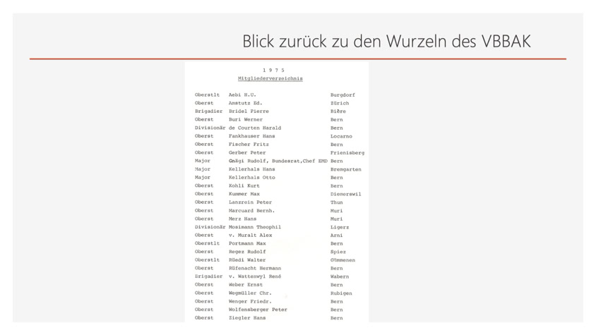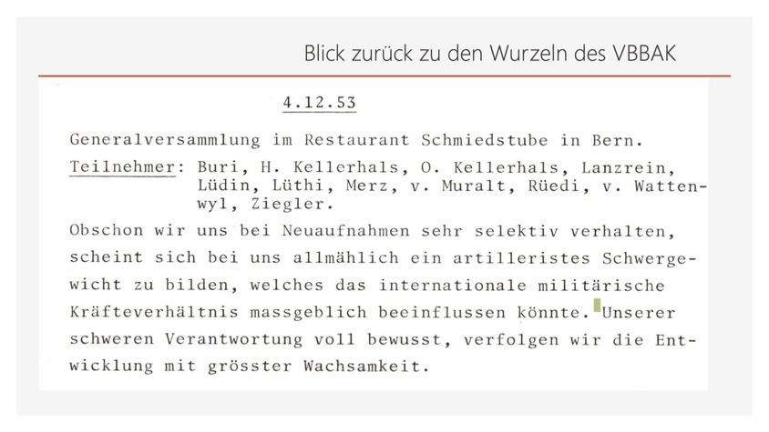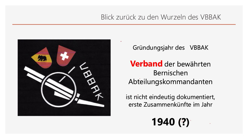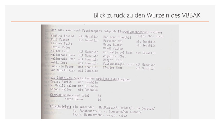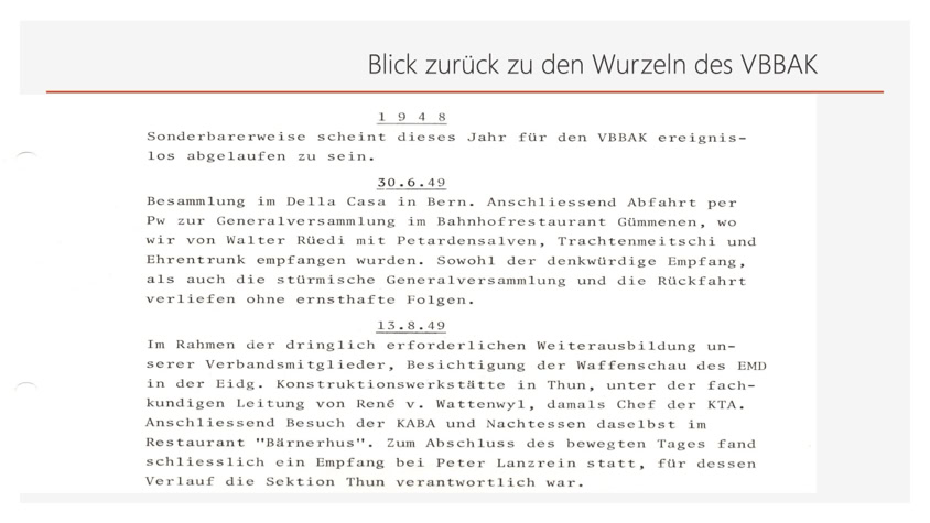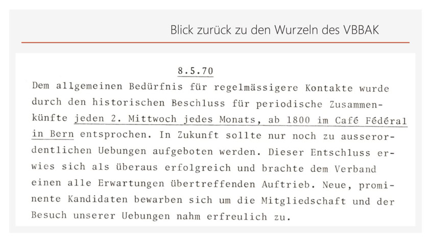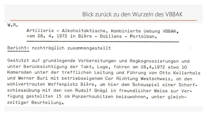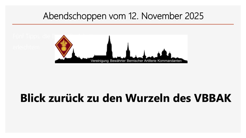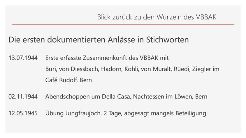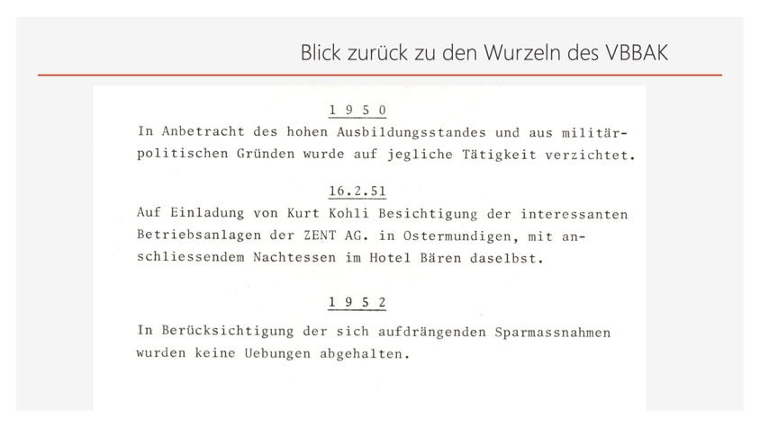 Unser Obmann, Ueli Emch hat sich die Mühe genommen und in den, zum Teil leider nur spärlich vorhandenen Ordnern und Dokumenten die Geschichte der Vereinigung zusammen zu tragen. Anlässlich des Abendschoppens vom 12 November 2025 hat er dann einen Einblick in die ersten Jahrzehnte des VBBAK präsentiert. Die dafür entstandene Präsentation ist hier zugänglich gemacht.
