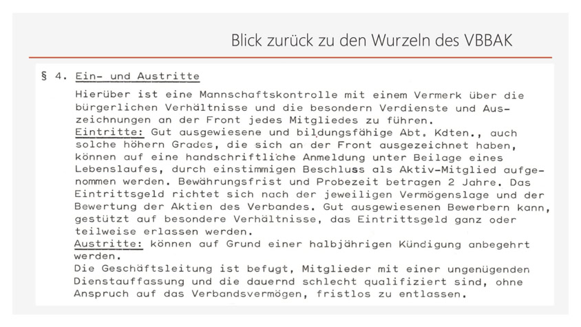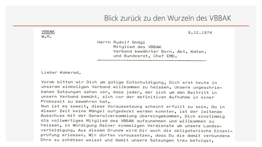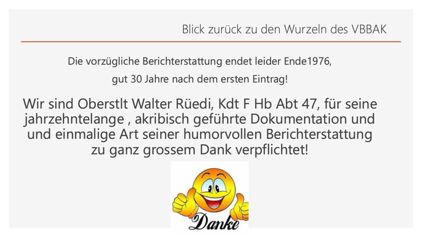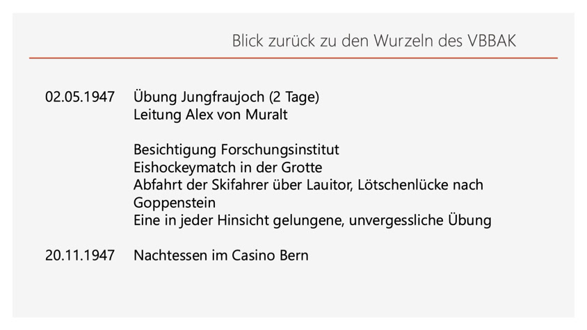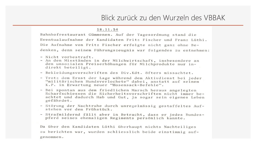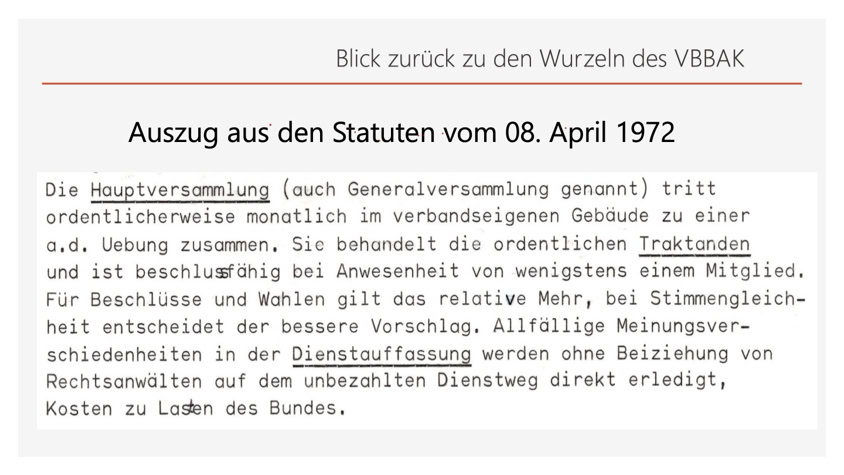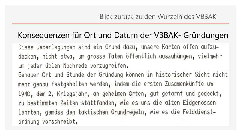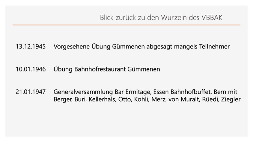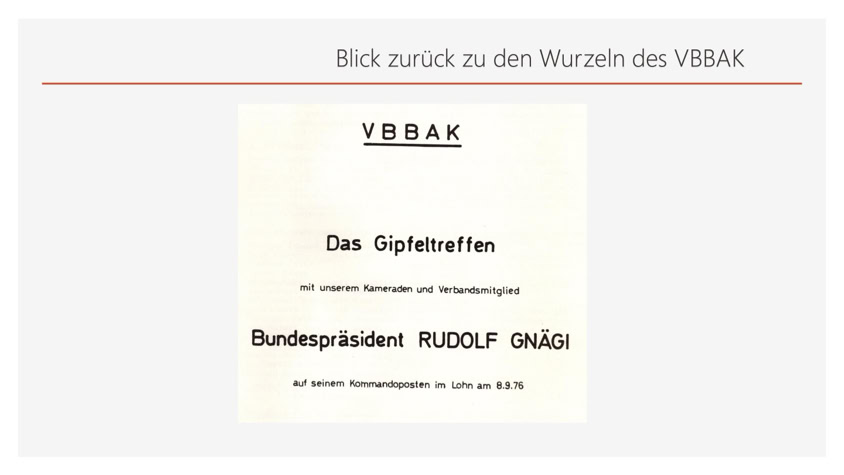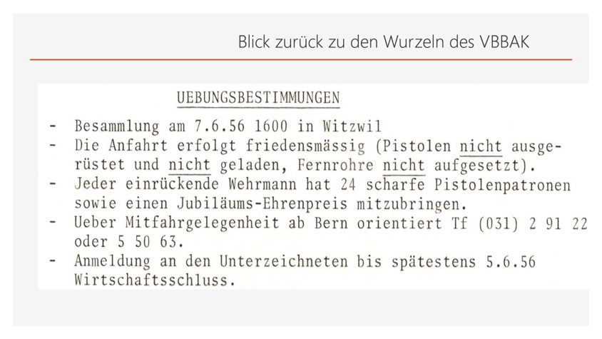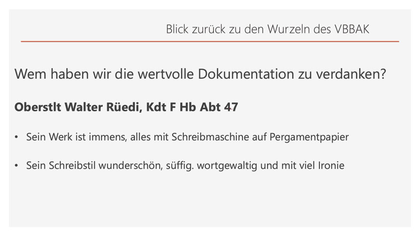 Unser Obmann, Ueli Emch hat sich die Mühe genommen und in den, zum Teil leider nur spärlich vorhandenen Ordnern und Dokumenten die Geschichte der Vereinigung zusammen zu tragen. Anlässlich des Abendschoppens vom 12 November 2025 hat er dann einen Einblick in die ersten Jahrzehnte des VBBAK präsentiert. Die dafür entstandene Präsentation ist hier zugänglich gemacht.