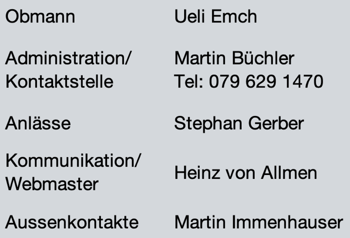 Es existiert keine Kasse und es wird auch kein Mitgliederbeitrag erhoben. Die anfallenden Kosten der Anlässe werden verursachergemäss oder wo angebracht, gleichmässig auf alle Teilnehmenden aufgeteilt und direkt beglichen.