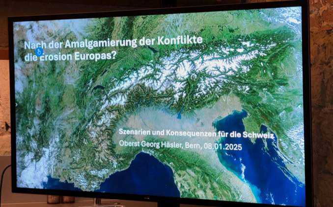 Kompetent wie immer präsentierte Georg eine Analyse der Weltpolitischen Lage, in der heute nicht mehr kooperative Sicherheit, sondern Machtpolitik vorherrscht. Dabei steht natürlich die Situation „Russland gegen den Westen“ im Zentrum. Aufgrund einer Beurteilung möglicher Szenarien für weitere politische Entwicklungen musste zur Kenntnis genommen werden, dass die Lage in Europa und der Schweiz zu Besorgnis Anlass geben. Ob dabei die Schweiz im heutigen Europäischen Konfliktgefüge noch eine sichere Insel ist, darf mit Recht in Frage gestellt werden.